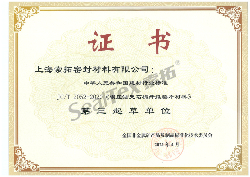 上海索拓密封材料有限公司(以下簡稱“我司”)參與起草了JC/T 2052-2020《輥壓法無石棉纖維墊片材料》標準