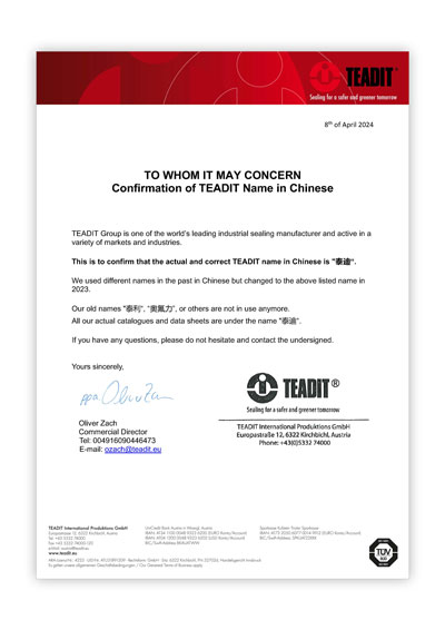 世界領先的工業(yè)密封制造商品牌TEADIT集團宣布:TEADIT于2023年起啟用新的中文名“泰迪”。